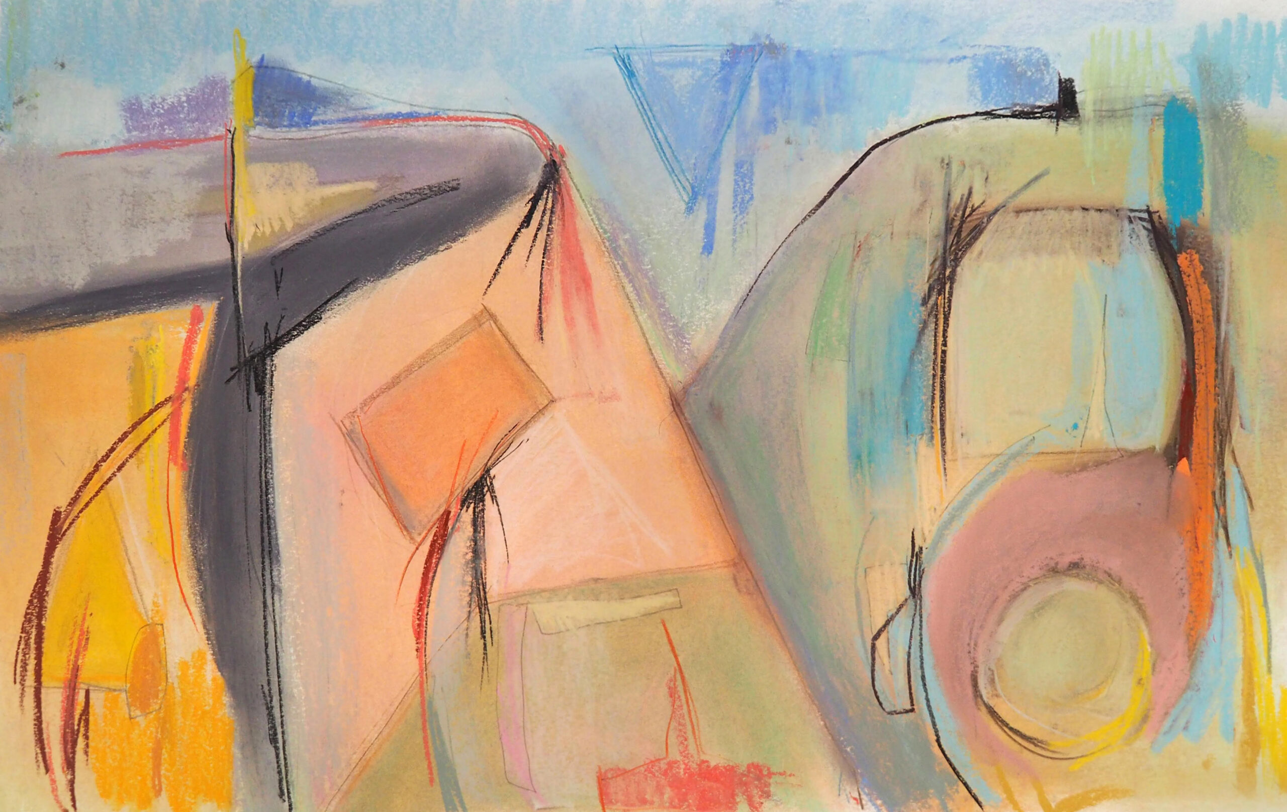 Stork works with pastels and pencil to explore abstract landscapes and expansive color fields. He often draws lines into the surface to create structure—an underlying framework that both supports and contrasts with the openness of the color. Pastels allow him to create subtle hues without constraints as he builds nuanced, shifting hues without being bound to specific figures or literal forms.
